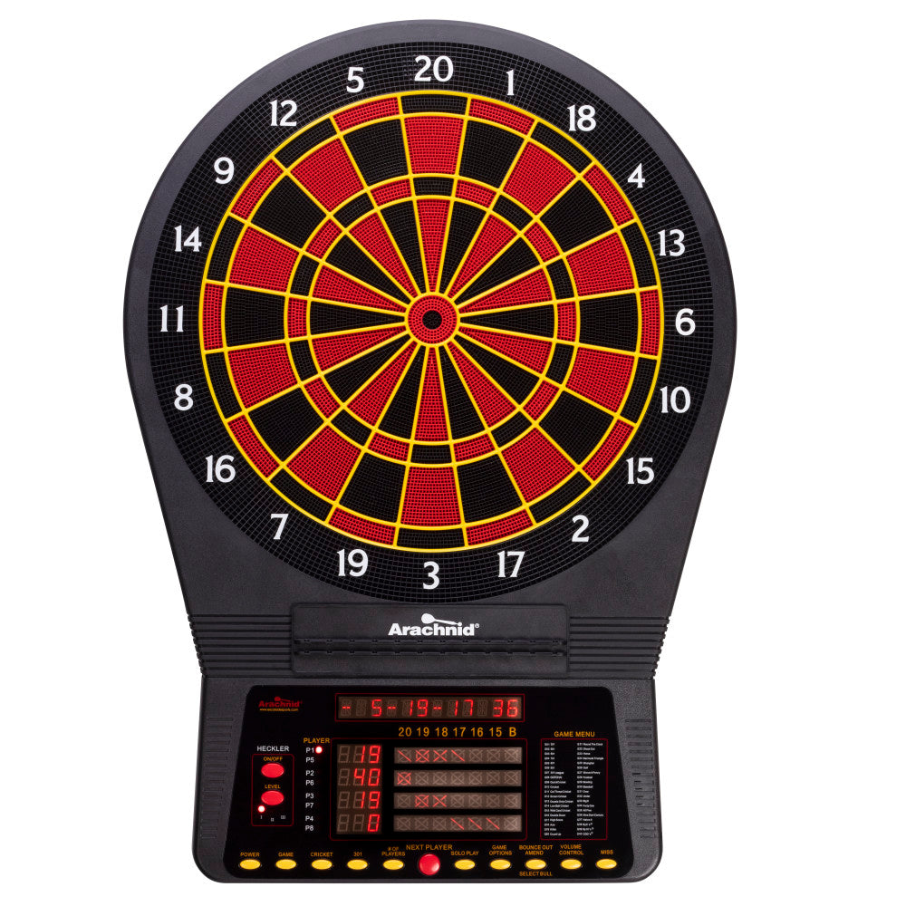 Take your dart game to the next level with the Arachnid Cricket Pro 800 Electronic Dartboard, built with a regulation-size target area for true arcade-style action. Whether it's your game room, garage, man cave, or bar setup, this board delivers authentic play and long-lasting performance for players of all skill levels. With 40 built-in games and 179 variations, including 7 cricket modes, this dartboard keeps things fresh and competitive no matter how often you play. Great for casual matchups or serious league-style games. The LED display supports up to 8 players, with a real-time scoring system and 4-player X/O cricket display. The integrated scrolling digital screen shows live game updates, dart score averages, and simplifies game navigation. For added excitement, the optional Heckler™ feature adds fun, crowd-style commentary and feedback in three intensity levels—perfect for parties, family nights, or friendly rivalries. Turn it on for laughs or off for focused competition. Built tough, the board features NylonTough™ segments and micro-thin dividers, reducing bounce-outs and increasing scoring precision—plus a tournament-style spider in Arachnid’s signature red and yellow colors for that classic arcade look. Multiple game modes include single/double in or out, solo play, and ranking features, while custom player assist options like handicap scoring, bounce-out correction, quick reset, and power-saving sleep mode let you tailor the game to your style. Proudly made by Arachnid, the #1 name in electronic dartboards, and backed by a 90-day limited warranty, this board is one of the best options available for families, casual players, and serious dart fans alike.