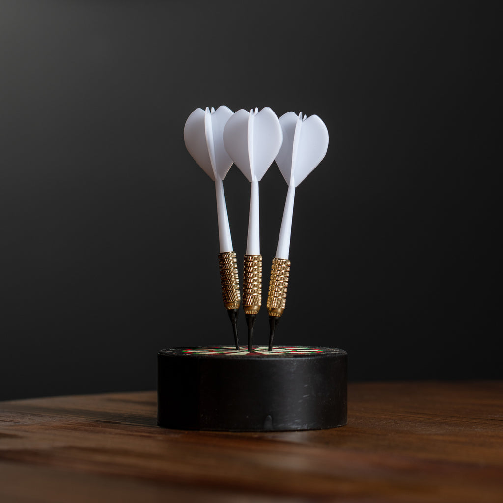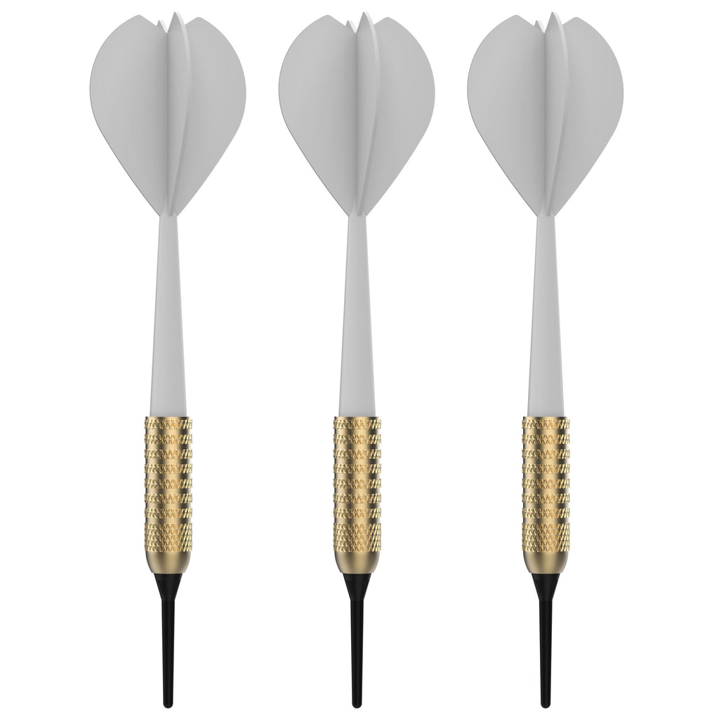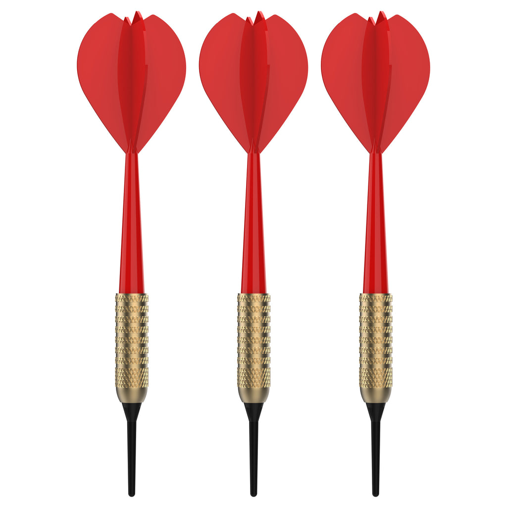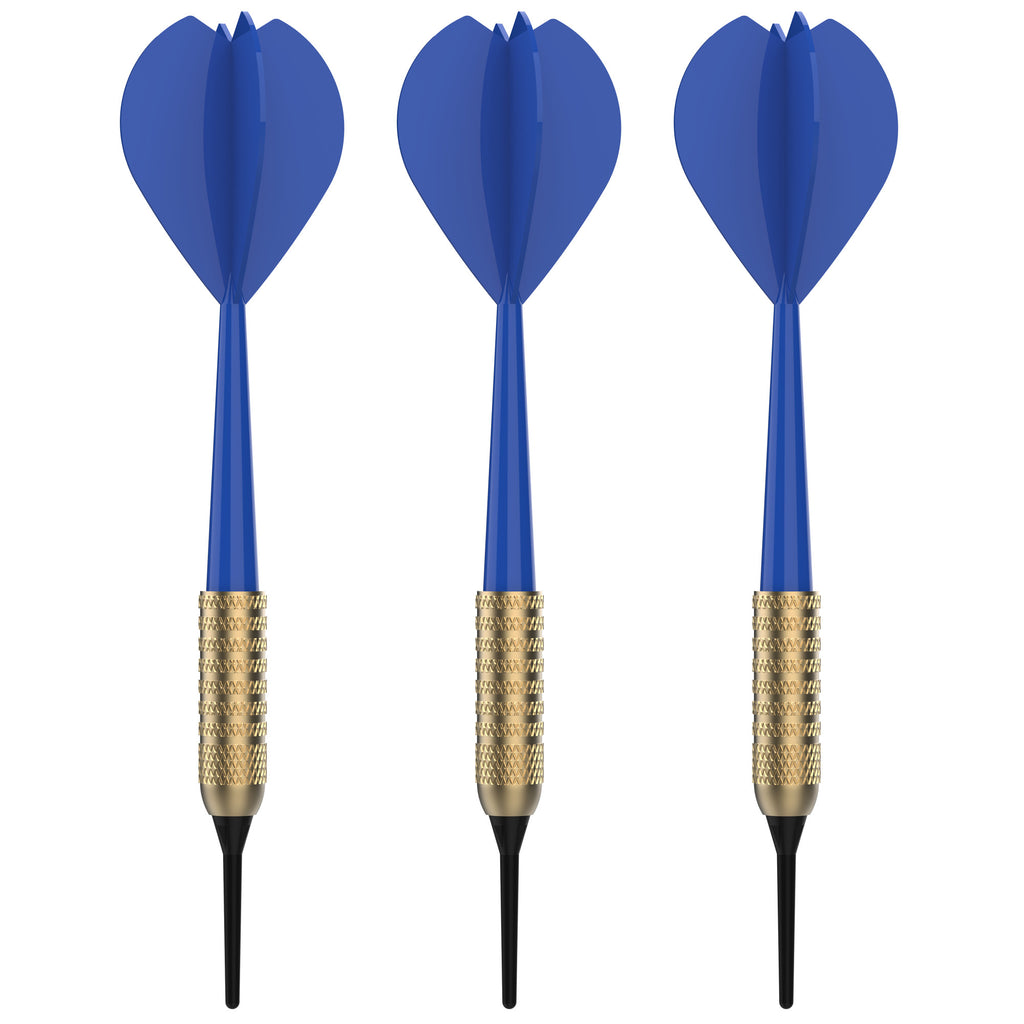 Enjoy a pack of 3 soft tip darts designed for recreational play. This pack features assorted colors such as blue, white, and red. The darts feature brass finish barrels, ensuring consistent and repeatable throws. With their one-piece construction, these darts are super durable, making them ideal for replacement pub darts or for novice players enjoying darts at home. With their colorful design, durable construction, and soft tips, these darts are perfect for recreational use and create a fun atmosphere for players of all skill levels.