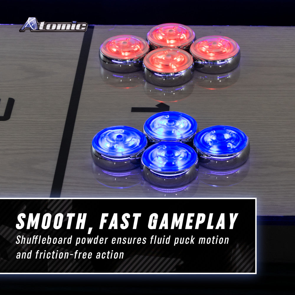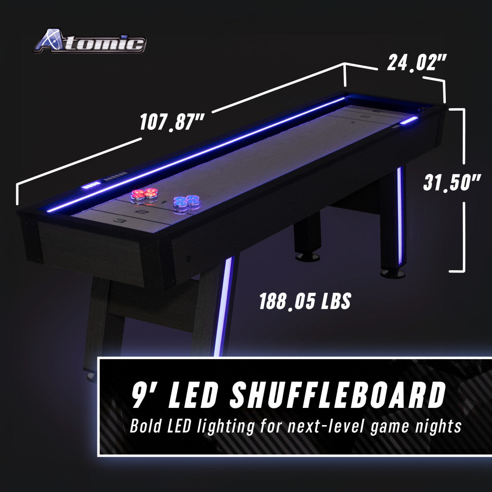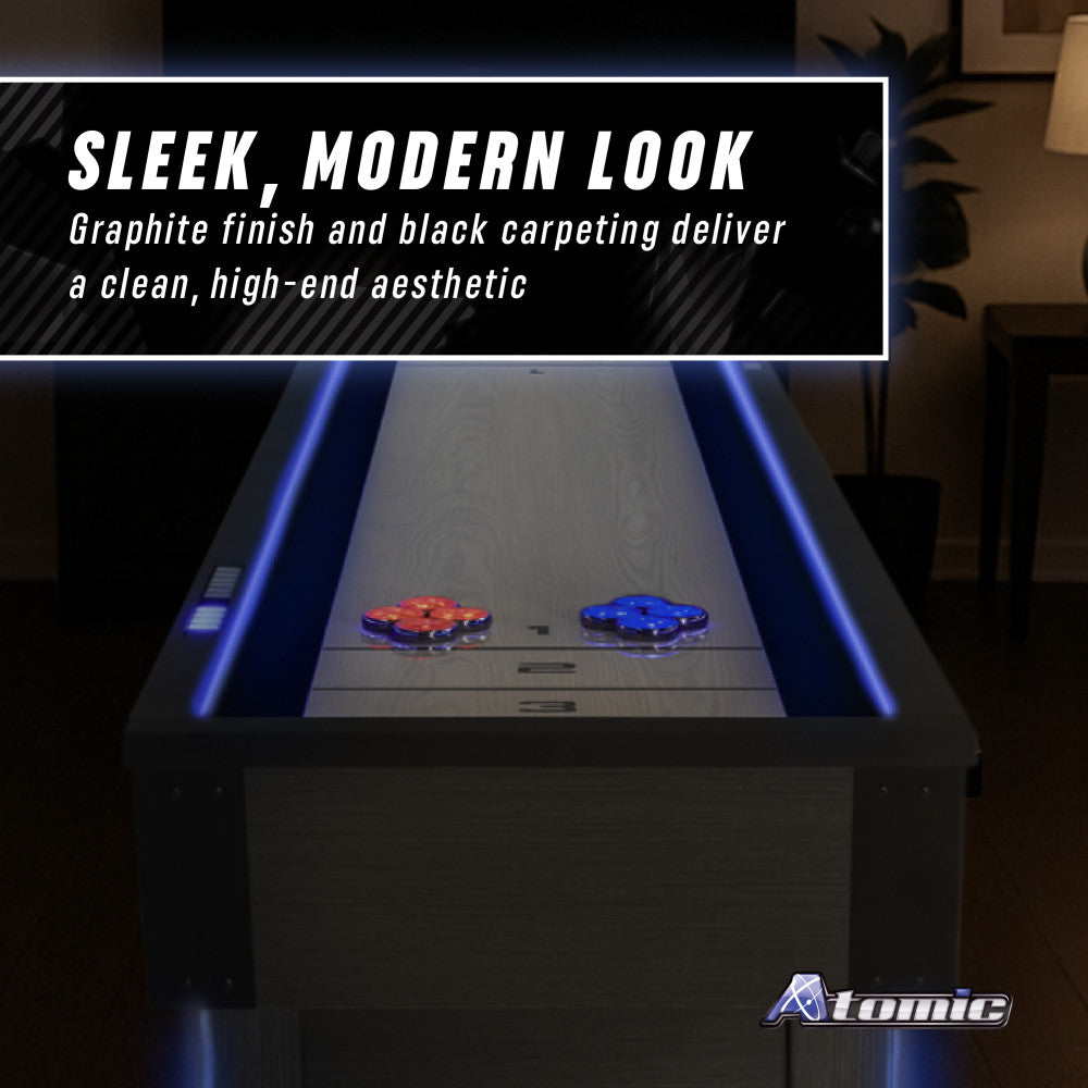 The Atomic 9' LED Shuffleboard Table combines a modern design with classic gaming features, offering an exciting addition to any game room. The table boasts bright LED accent lighting along the rails and legs, creating an eye-catching display for both shuffleboard and a bonus bowling game. Its sleek graphite construction with black carpet adds a contemporary touch to the aesthetic. Designed for smooth gameplay, the table includes shuffleboard powder to reduce friction and ensure a seamless experience. The set comes with all necessary accessories, including an AC adapter for the LED lights, ten bowling pins, a pin setter, a surround to prevent pins from falling off the table, and eight chrome metal weighted pucks for shuffleboard. Enjoy two games in one with this versatile and stylish table.