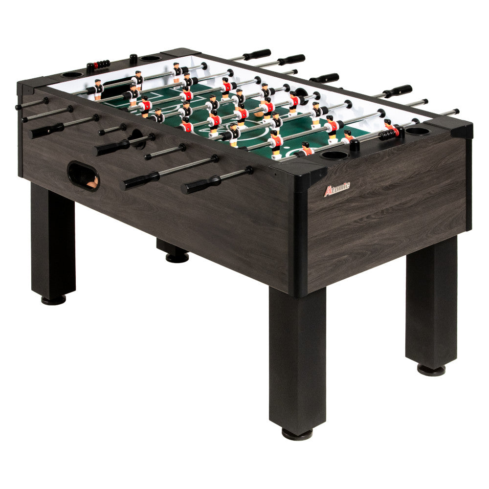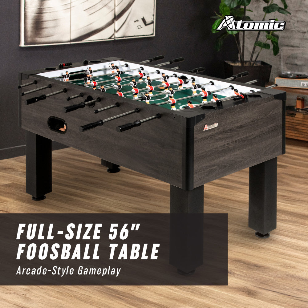 Bring high-energy competition to your home game room, basement, or man cave with the Atomic Gladiator 56” Foosball Table—built for serious fun and fast-paced play. Designed for adults, teens, and families alike, this full-size table features solid steel rods with ergonomic solid wood handles for superior control, plus an internal ball return system and side ball entry to keep the action moving. Oversized 3.5" leg levelers ensure a level playing field on any surface, while integrated cup holders and classic abacus scorekeepers add convenience and style. Whether you're hosting a party, challenging friends, or setting up a rec room centerpiece, the Atomic Gladiator is ready for intense matches and long-lasting durability—and with four foosballs included, you can jump right into the game straight out of the box.
