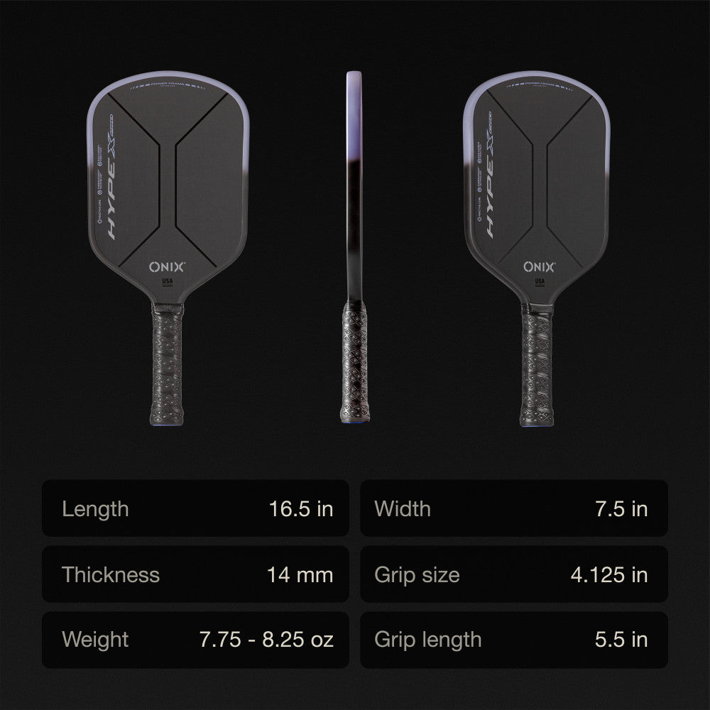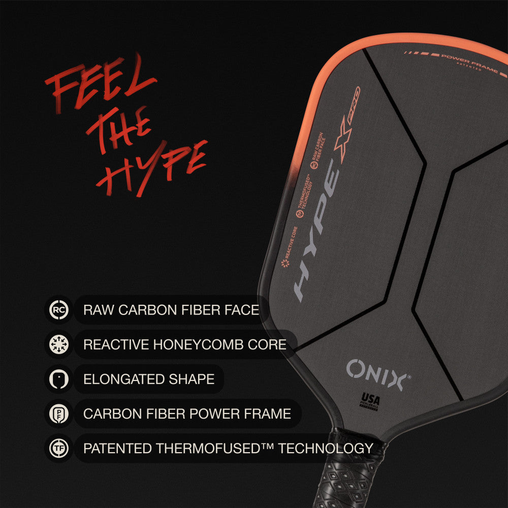 This is your next pickleball paddle. Introducing Hype X Pro. No fads or fluff. Just tested and perfected features that make your game more dynamic (with a Raw Carbon Fiber Face for more spin and Reactive Honeycomb Core for more pop), more consistent (with an elongated shape for a larger sweet spot) and more fun, for longer (with a patented Carbon Fiber Power Frame with ThermoFused™ Technology for more durability). All from a brand that's been around since before the boom. This is the next generation of performance paddles for the next phase of your game. The one you get when you're ready to move from pickleball parties to a pickleball league (if that's your thing). When you know you're not a pro but kind of want to feel like one.