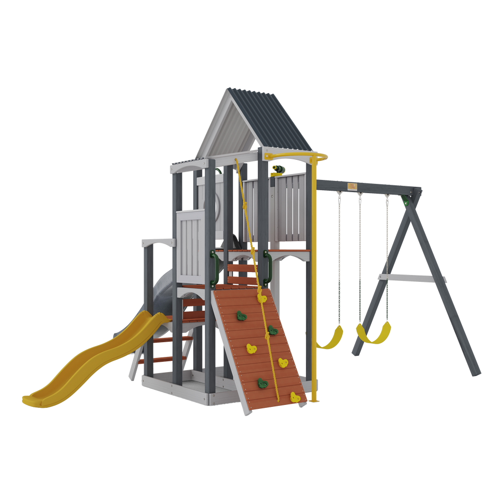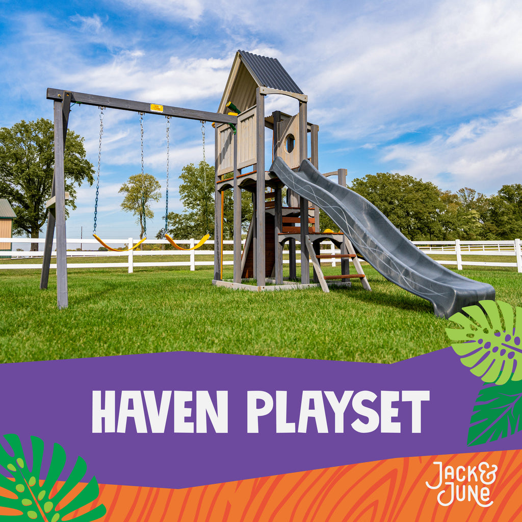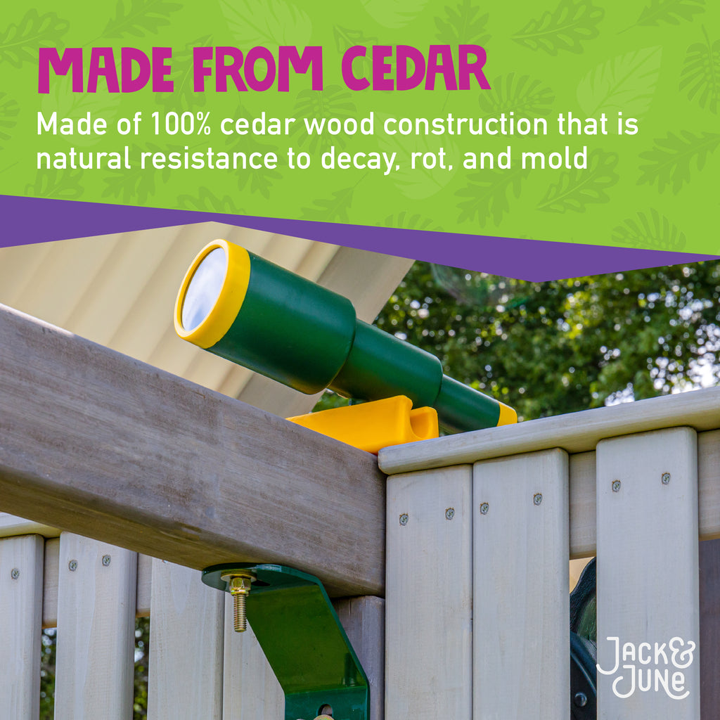 Inspire active play and creativity with all the elements kids love. The Jack & June Haven Outdoor Playset provides years of healthy outdoor fun for both younger and older children. There is a yellow smaller slide and gray larger slide to allow all ages to experience safe, fun sliding. The Haven has three entry and exit points available, and three different deck heights. The wooden swing set includes two belt swings, telescope, steering wheel, fireman’s pole, rock climbing wall with a climbing rope, standard step ladder, port window, and safety handles. New to the Haven is an all-new and upgraded one-piece yellow small slide design with high borders and made of a foam HDPE material for less friction and better glide. All swing hardware and chains are included. This must-have backyard playset is made of naturally decay and insect resistant cedar. Ignite imaginations with Jack & June’s Haven.