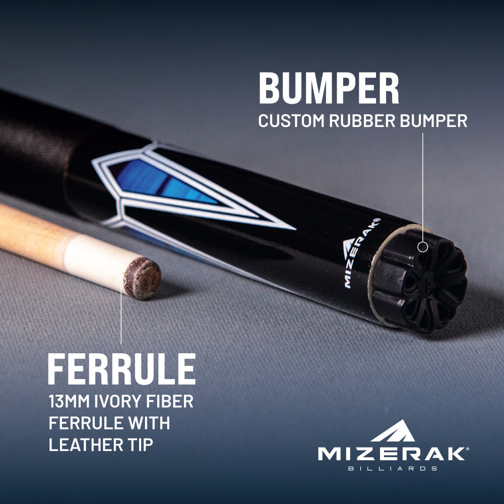 The Mizerak 57" Deluxe Two-Piece Hardwood Cue is crafted from high-quality hardwood and features a sleek black gloss finish with decorative accents, making it both stylish and durable. It is equipped with a 20mm aluminum joint for a solid, reliable connection and an improved grip with a black nylon wrap for better control. The cue includes a 13mm ivory fiber ferrule with a leather tip, ensuring precise and consistent shots. A custom rubber bumper is added for protection and durability, making this cue a premium choice for players seeking a blend of elegance and performance.