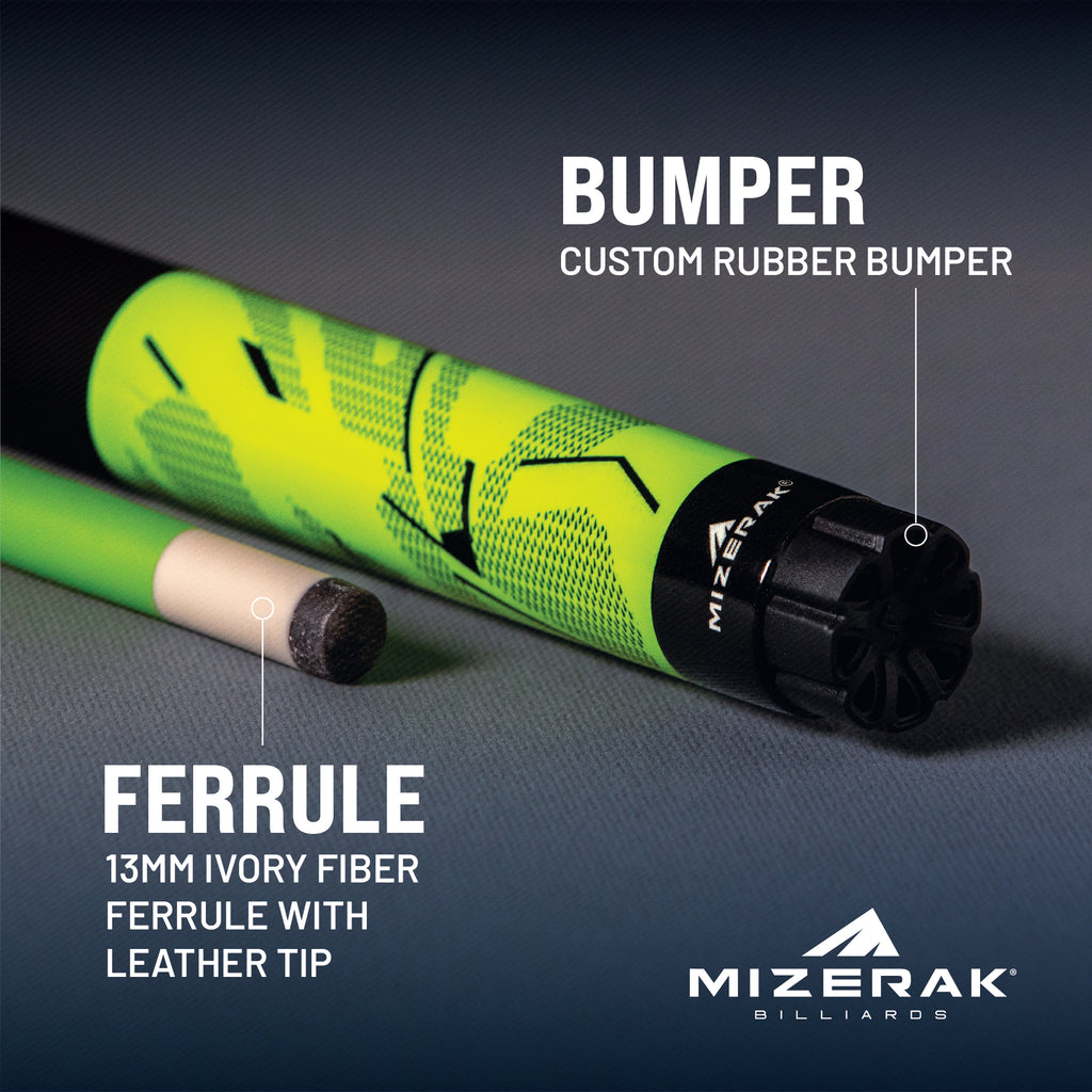 The Mizerak 58" Two-Piece Neon Composite Cue features advanced Straightline Composite Warp Resistant Technology for superior durability. It includes a 20mm stainless steel joint for secure connections and easy assembly. The cue is designed with a non-slip MicroTac coated grip for enhanced accuracy and control. It also features a 13mm ivory fiber ferrule with a leather tip for precise play and a custom rubber bumper for added durability. Ideal for players seeking a high-performance cue with modern design elements.