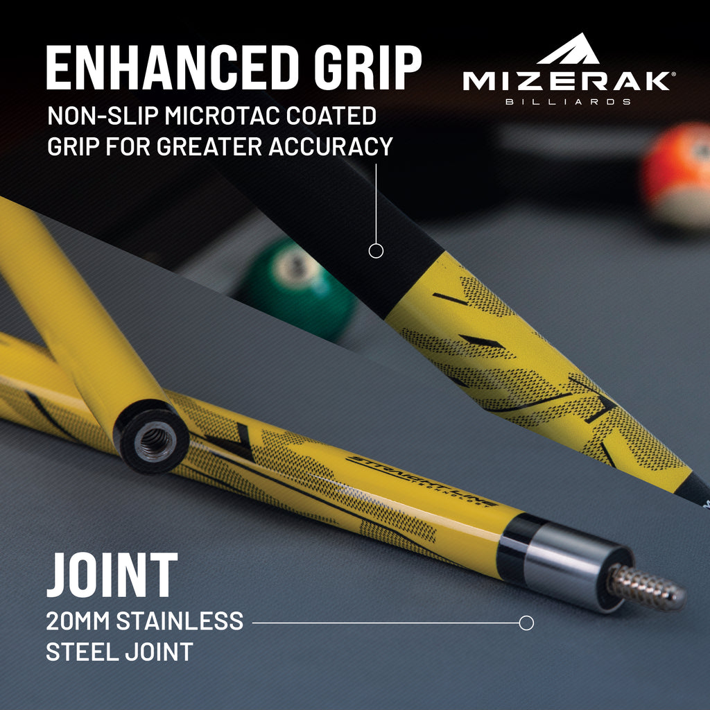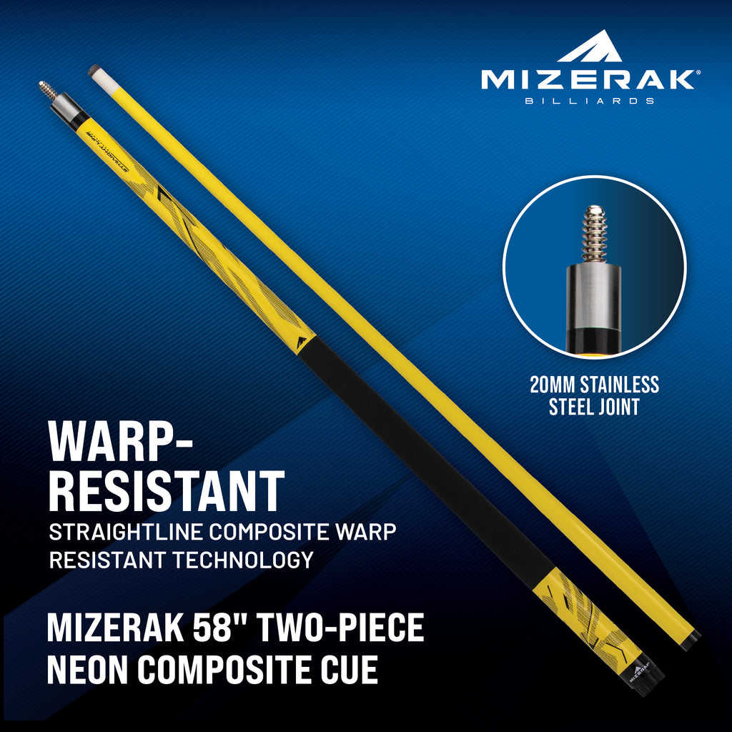 The Mizerak 58" Two-Piece Neon Composite Cue features advanced Straightline Composite Warp Resistant Technology for superior durability. It includes a 20mm stainless steel joint for secure connections and easy assembly. The cue is designed with a non-slip MicroTac coated grip for enhanced accuracy and control. It also features a 13mm ivory fiber ferrule with a leather tip for precise play and a custom rubber bumper for added durability. Ideal for players seeking a high-performance cue with modern design elements.