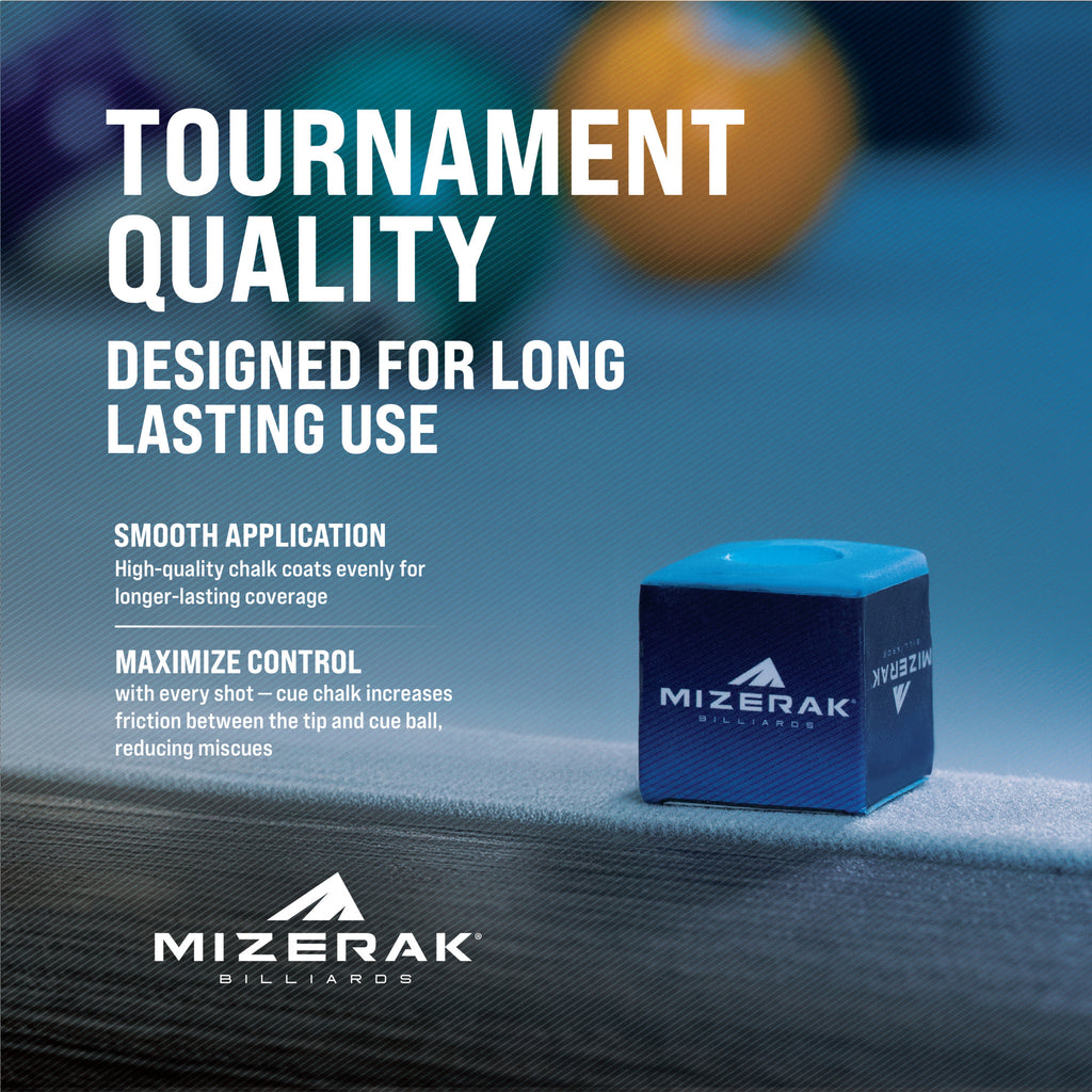 The Mizerak Chalk - 6 Pack is a must-have for any pool player, providing consistent cueing action and enhanced play. This pack of six chalks helps reduce miscues, ensuring more reliable and accurate shots. It enhances control, allowing players to achieve greater impact and precision. The chalk is of tournament grade quality, making it ideal for highly competitive play. Essential for players at all levels, this chalk is a crucial addition to any billiard setup, ensuring better performance and smoother gameplay.