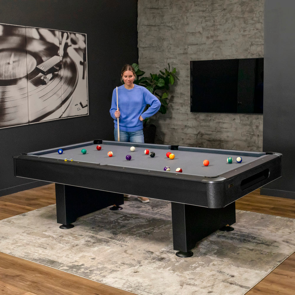 The Mizerak Dakota 8' Slate Billiard Table is a heavy-duty table that offers ultimate durability and sleek styling to complement any game room. The table features reinforced pedestal legs with hammer-toned leg levelers to keep your playing surface level, 3 5/8" laminate top rails with full profile K66 nose rubber for uniform rebound and consistent play, and metal frame rails. The Dakota offers rail integrated pockets and an internal ball return system. You have everything you need to start playing with two included cues, a set of billiard balls, triangle, brush, and two pieces of chalk.