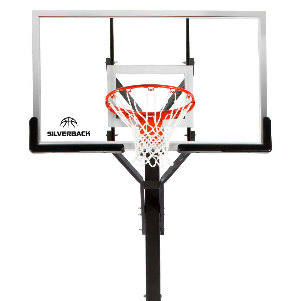 The Silverback SB54iG, our premier in-ground basketball hoop, features a tempered glass backboard and powder-coated steel pole that is directly installed into the ground and secured by concrete. The SB54iG uses a crank actuator to adjust the goal from the NBA and NCAA regulation rim height of 10 feet to the safety-approved height of 7.5 feet. The SB54iG comes complete with a pole and backboard pad to offer protection during lay-ups and a break-away rim that flexes under pressure. Backed by a 5-year limited warranty, the Silverback SB54iG is a perfect hoop system for your family.