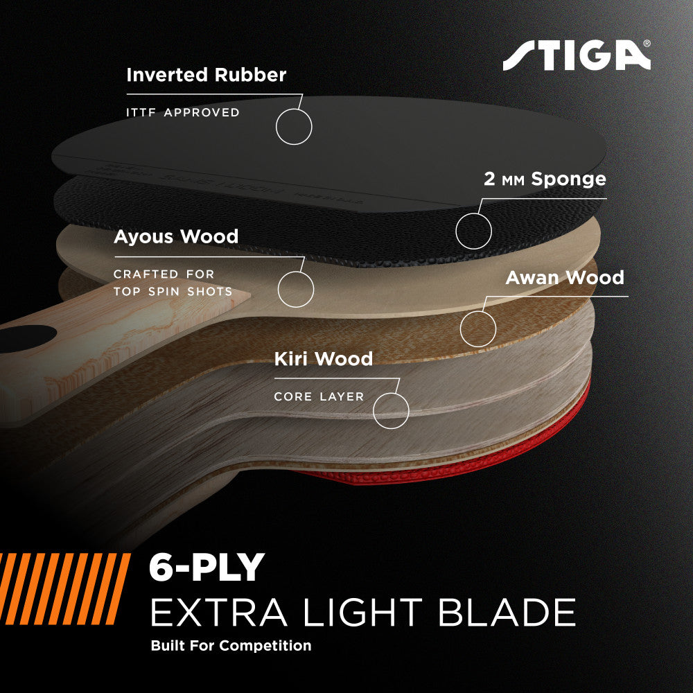 - BUILT FOR COMPETITION – STIGA's ACS Technology combines microscopic air capsules in the ITTF approved smooth inverted rubber for high speed and spin with maximum elasticity and outstanding control—the perfect racket for tournament play.